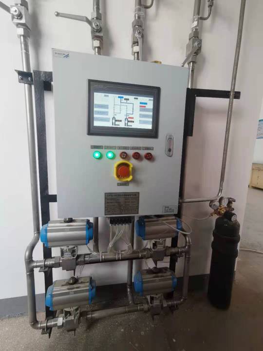 全自动氩气二氧化碳配气设备设备进口高压软管统配,各进气端集中连接至唯一出口端,出口端设置取样口及不合格气排放口,由各路高精度数字气体压力传感器测量并控制需要配比的气体的压力,达到控制气体注入的量来配比混合气体百分含量。每一路需要配比的气体由高压气动阀门及压力传感器组成,当达到设定的压力时自动关闭阀门,停止气体的输入。配比由PLC自动控制,触摸屏实时显示配比流程及参数,压力配比具有以下优点,主要用于大流量配比。